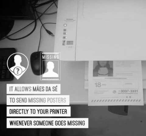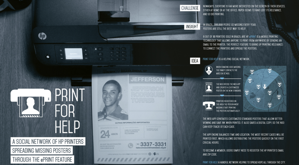 Print for help is a helping social network. To became a member, user simply need to register the HP printer's email and zip code. When someone goes missing the family contacts the "Mães da Sé" NGO, the NGO enters the web APP and creates a customized poster on the new standard, so printers registered on the area the person went missing start printing the posters automatically.