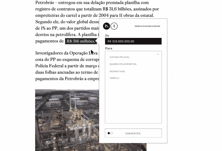 We developed an algorithm that uses NLP (Natural Language Processing) to analyze the content and context of the news that a user is reading on Estadão newspaper website. If it detects a correlation with political embezzlement, all the values (in Brazilian Real currency) are highlighted (regardless of spelling) and when the user interacts with them, a tooltip appears and allows him to choose in which public goods or service he wishes to convert it. After chosen, the user is redirected to the website “From Real to Reality – The corruption converter” to see the conversion result and all the dynamically generated infographics that illustrate the brutal truth, or also browse through other conversions.